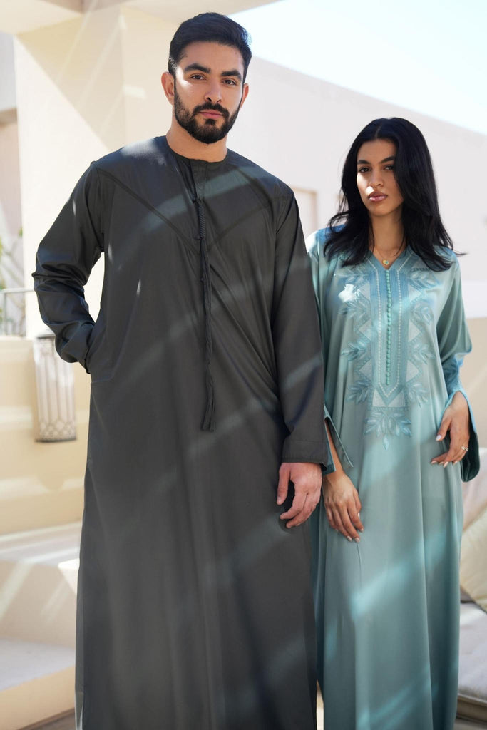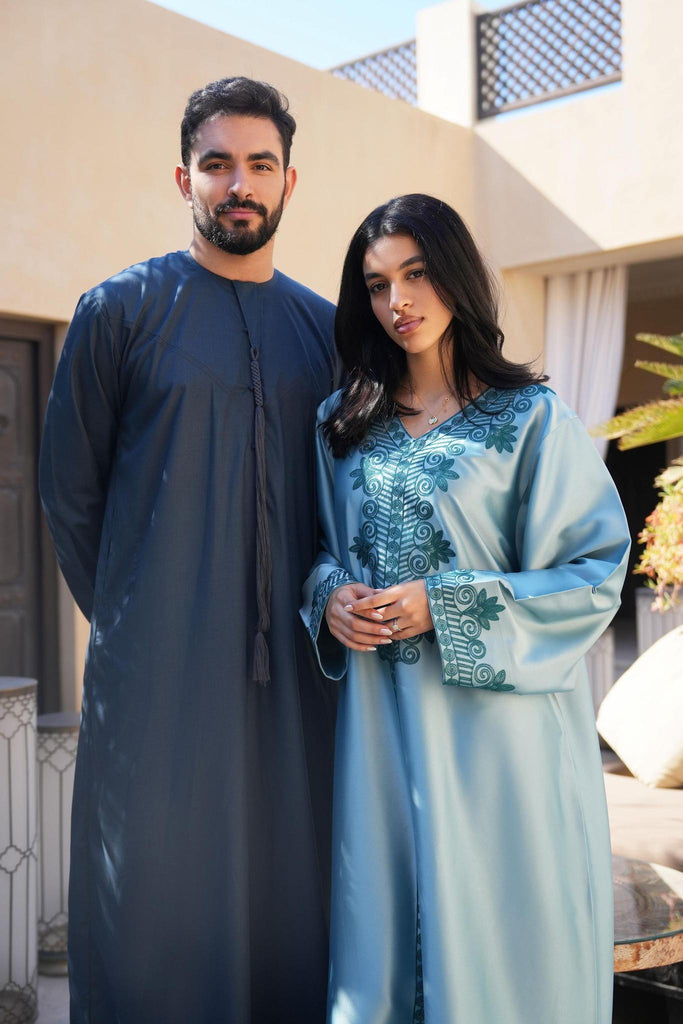 Perfect for special occasions, family events, or elegant everyday wear, this range beautifully pairs our stunning women's jalabiyas and abayas with matching men's kandoras. Designed with complementary colours, luxurious fabrics, and intricate detailing, our couples outfits are perfect for making a stylish and memorable statement.