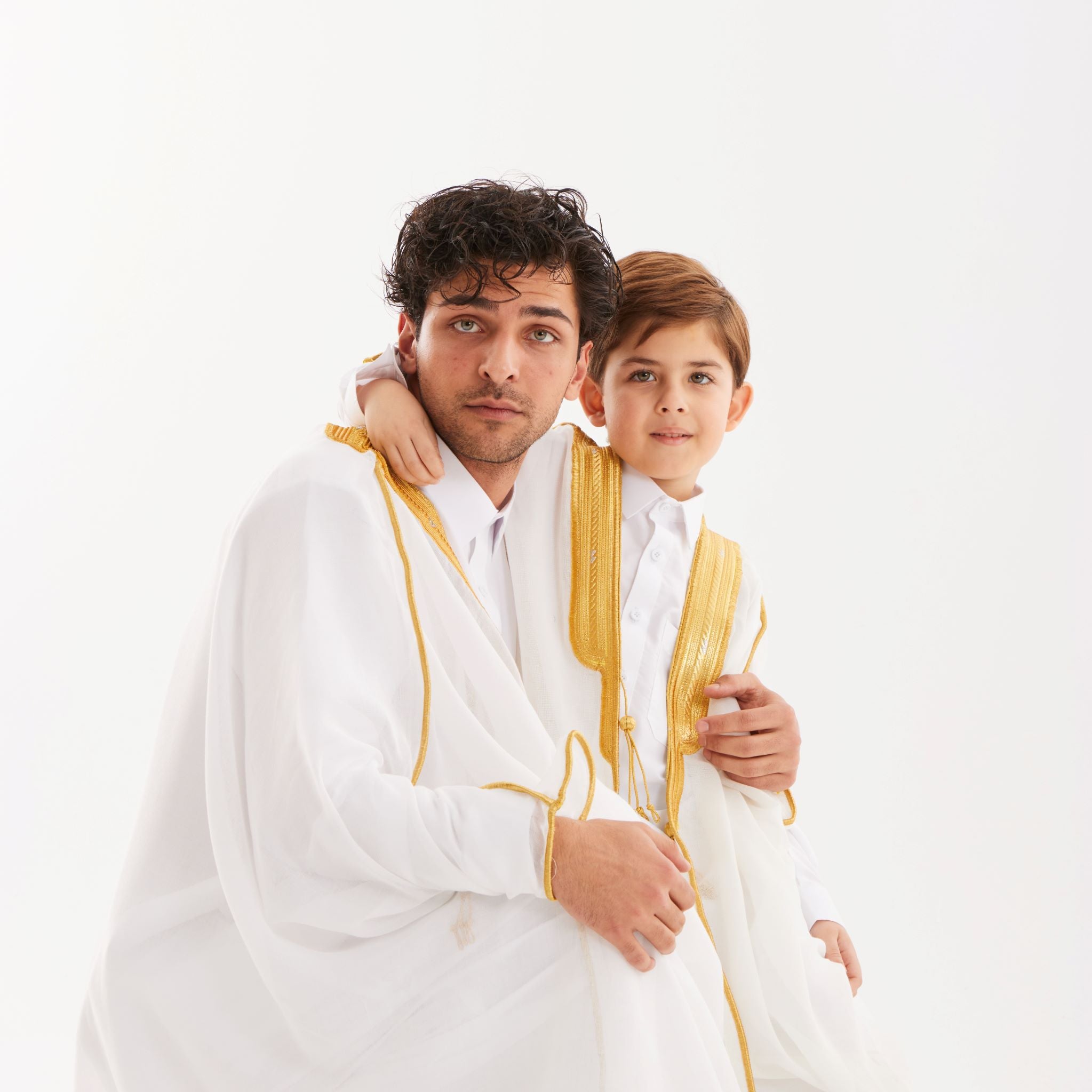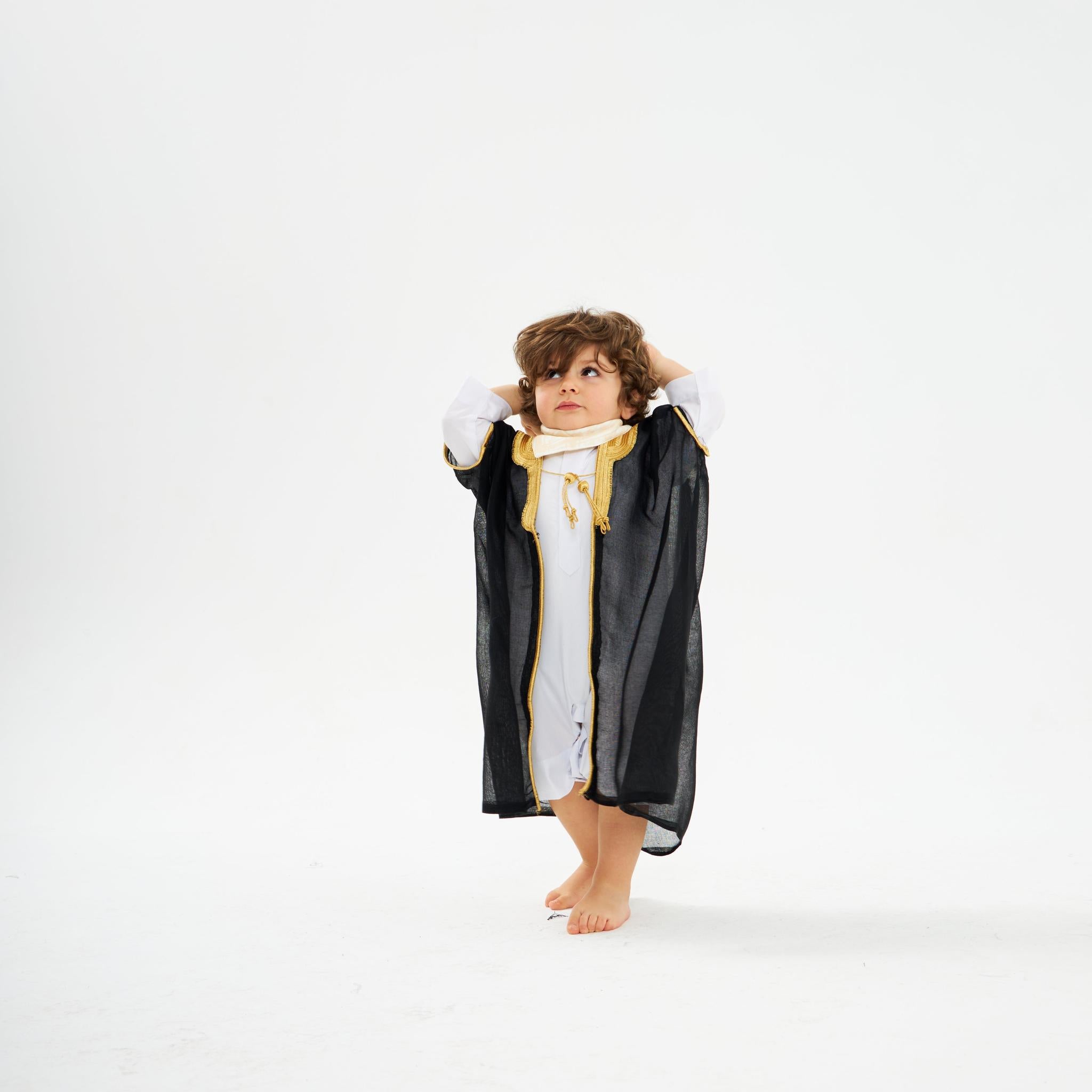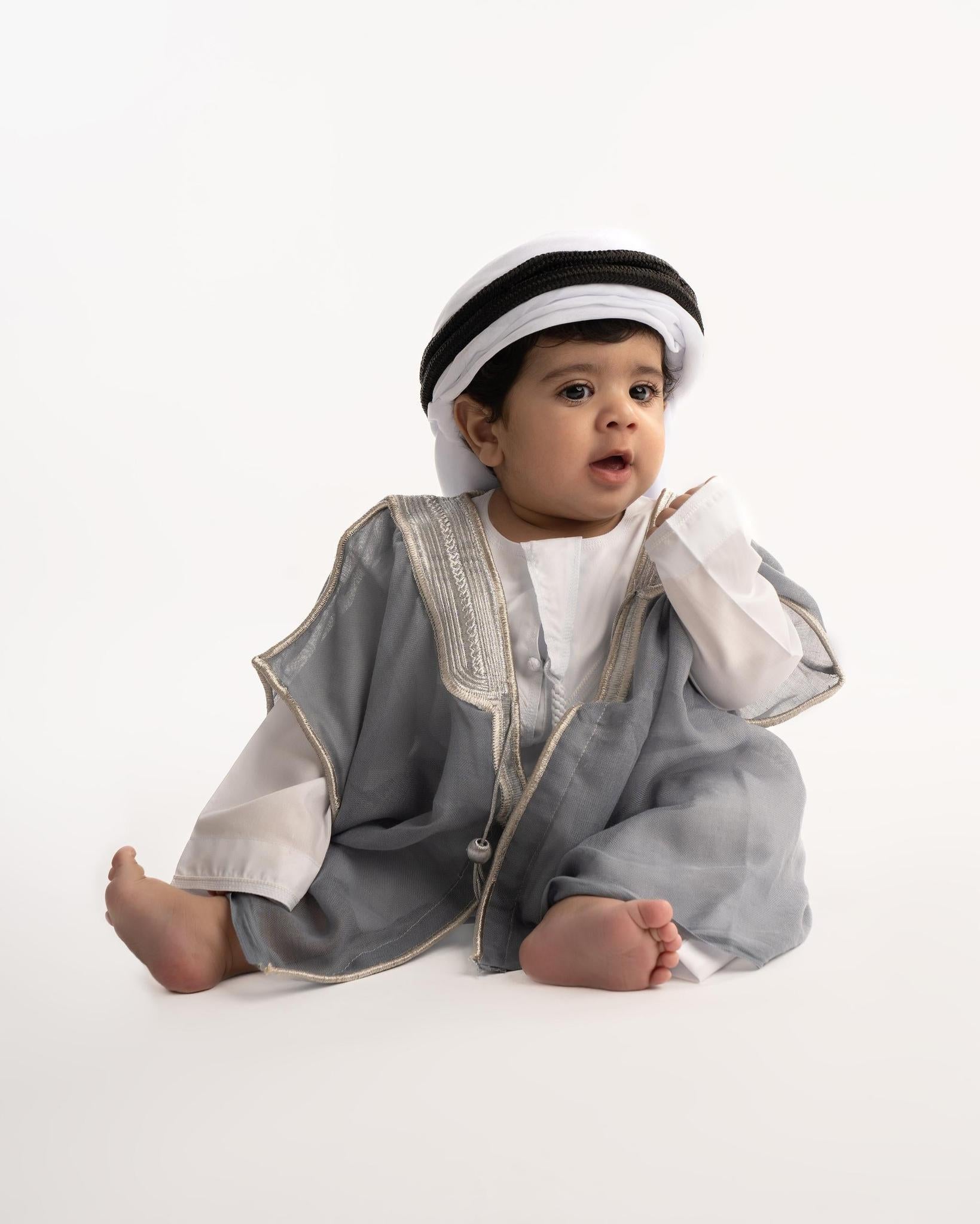 A Bisht is a traditional Arabic cloak worn by men and boys that adds a touch of elegance and sophistication to the overall look.