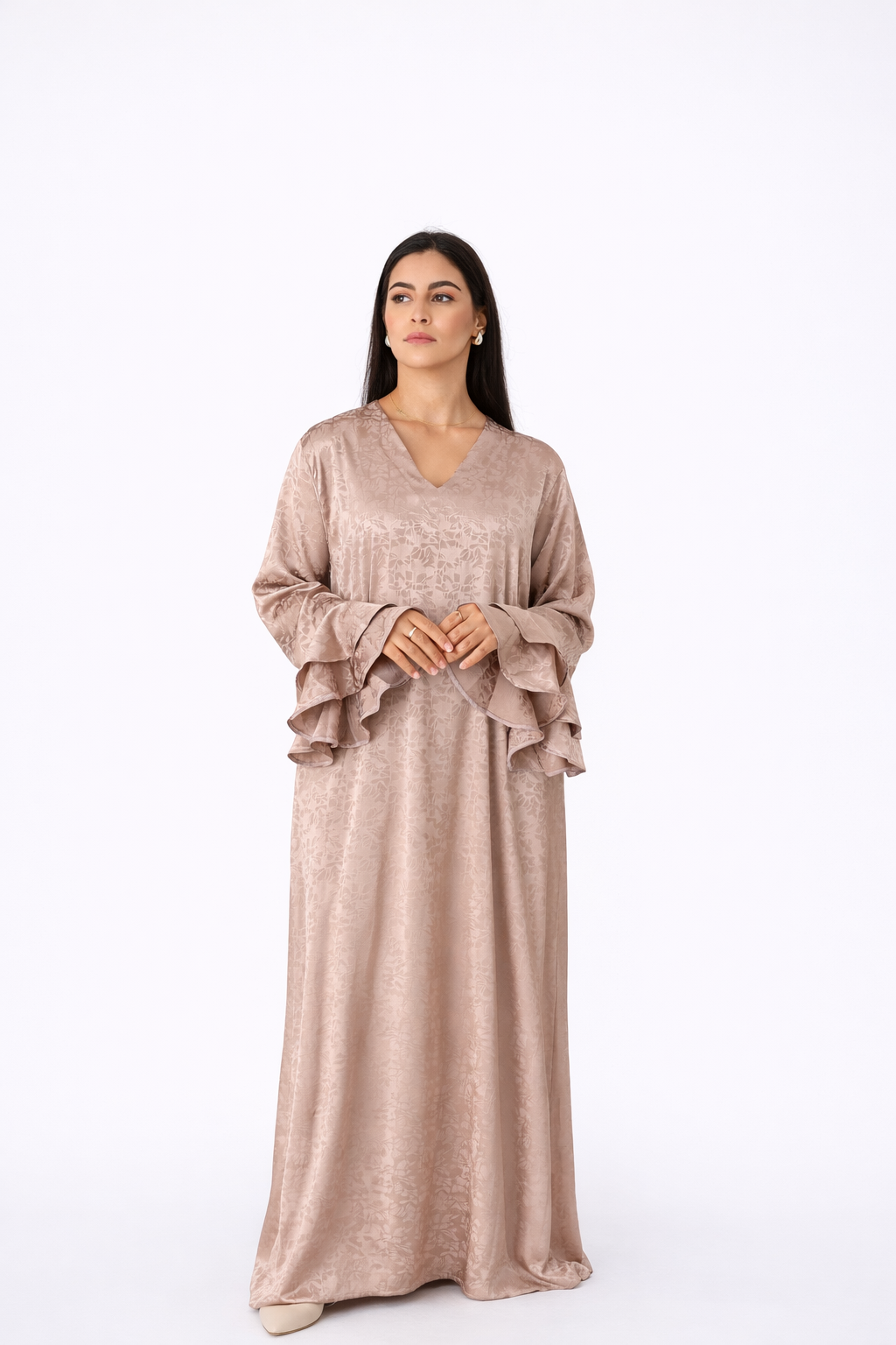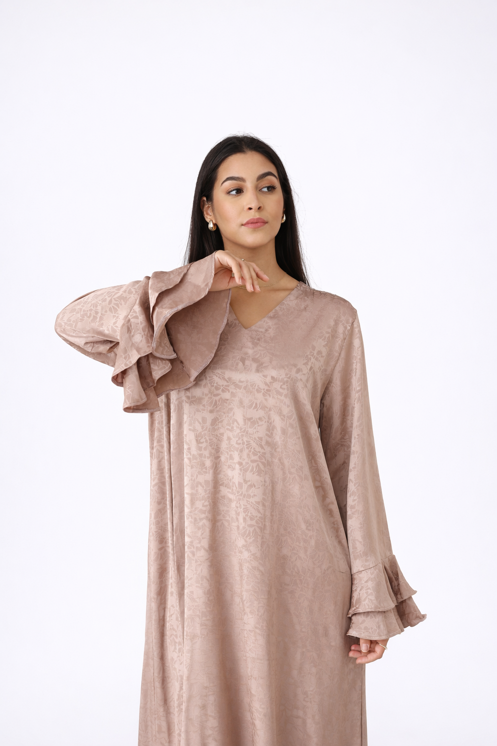A timeless piece crafted in a luxurious jacquard print that subtly catches the light with every movement. The rich olive green hue brings a natural elegance, while the wide frilled sleeves add a soft, feminine flair.
