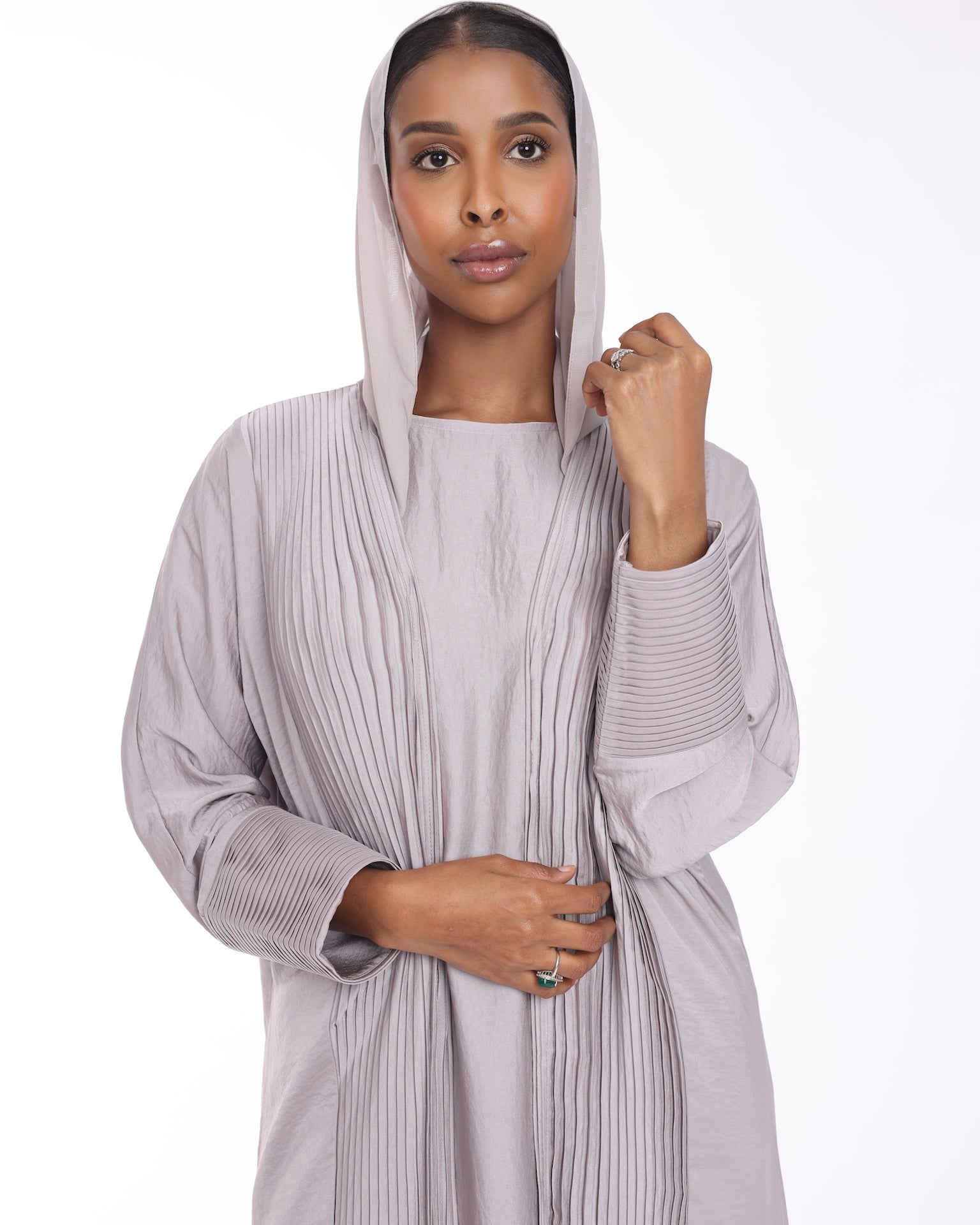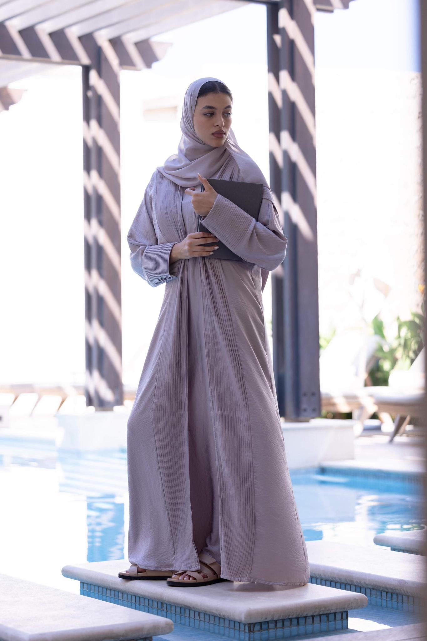 The slip dress and Kimono abaya are made of the same crinkled fabric for an elegant look.