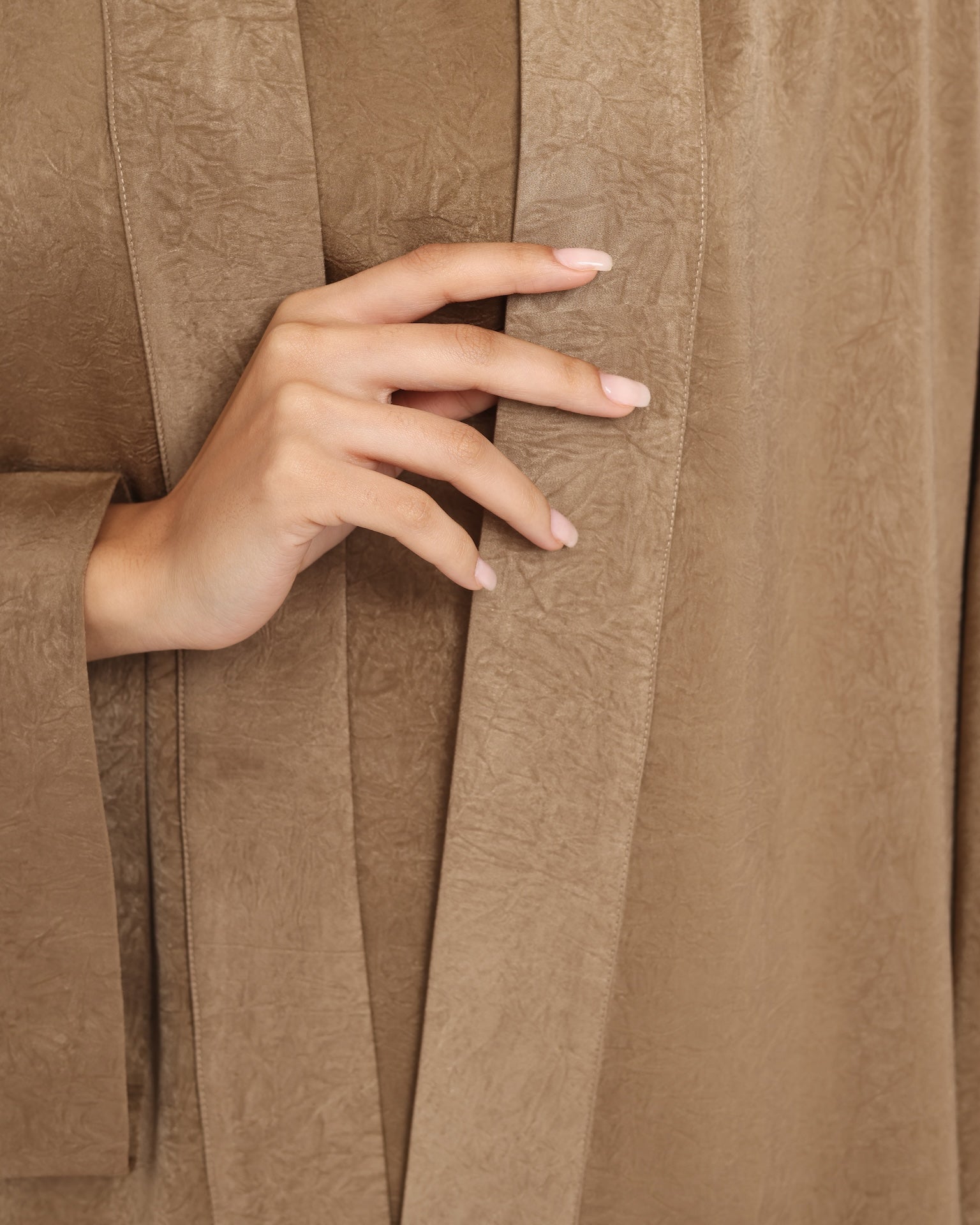 The slip dress and Kimono abaya are made of the same crinkled fabric for an elegant look.