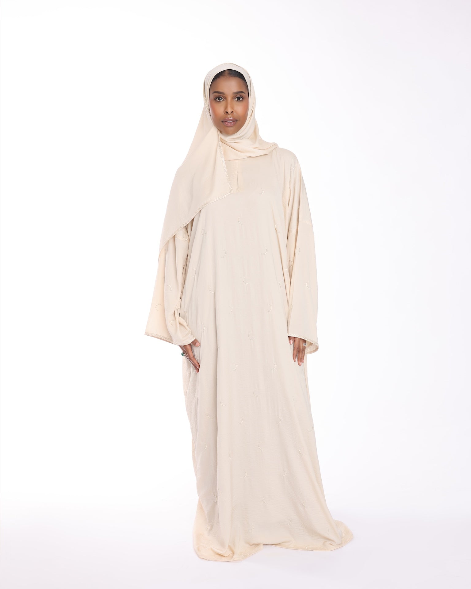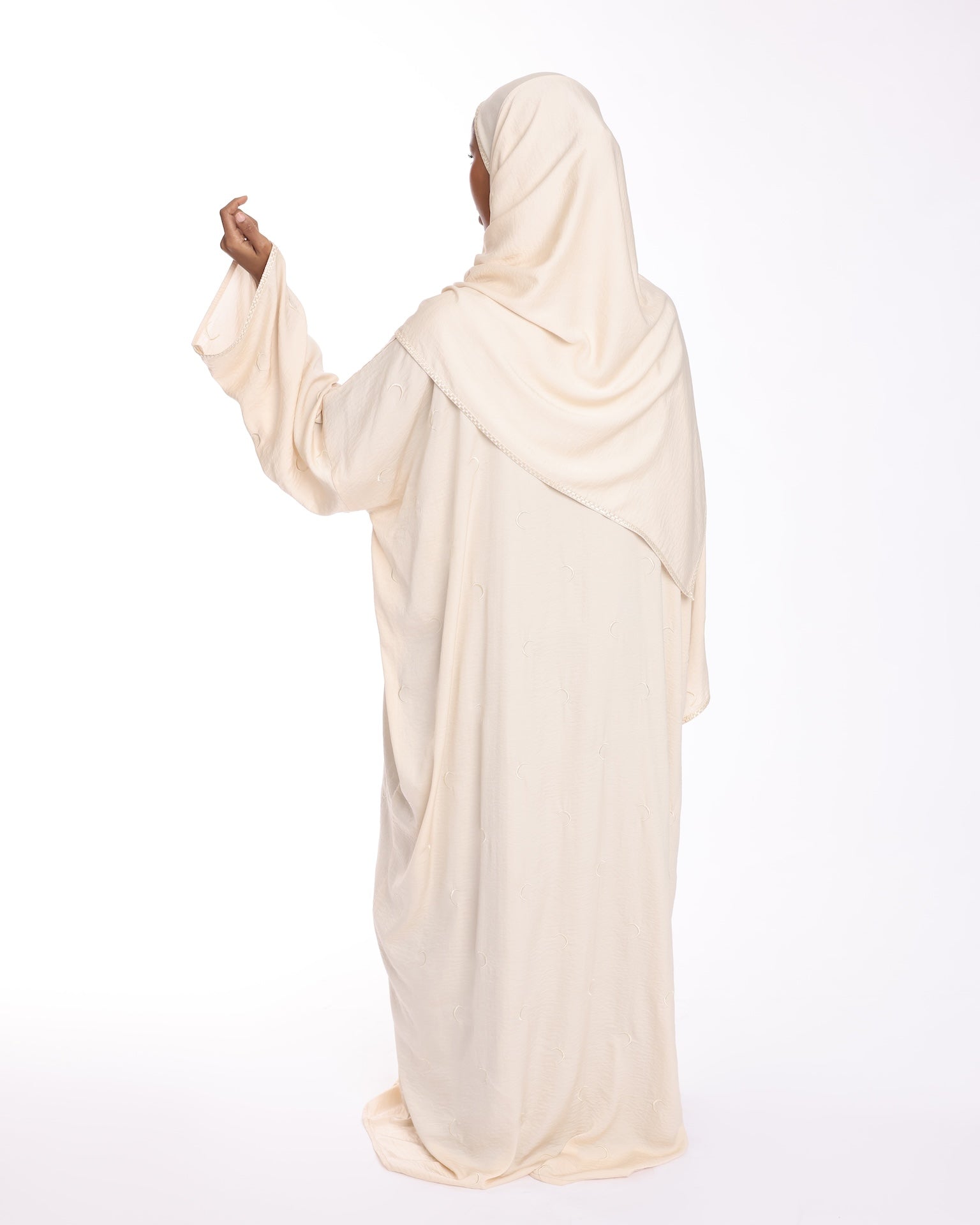 Luxurious Hareer prayer abaya with attached hijab. Designed with an attached hijab, this prayer abaya allows ease and elegance with every Salah. Getting you ready for Ramadan, its unique design is an essential for your nights of duas