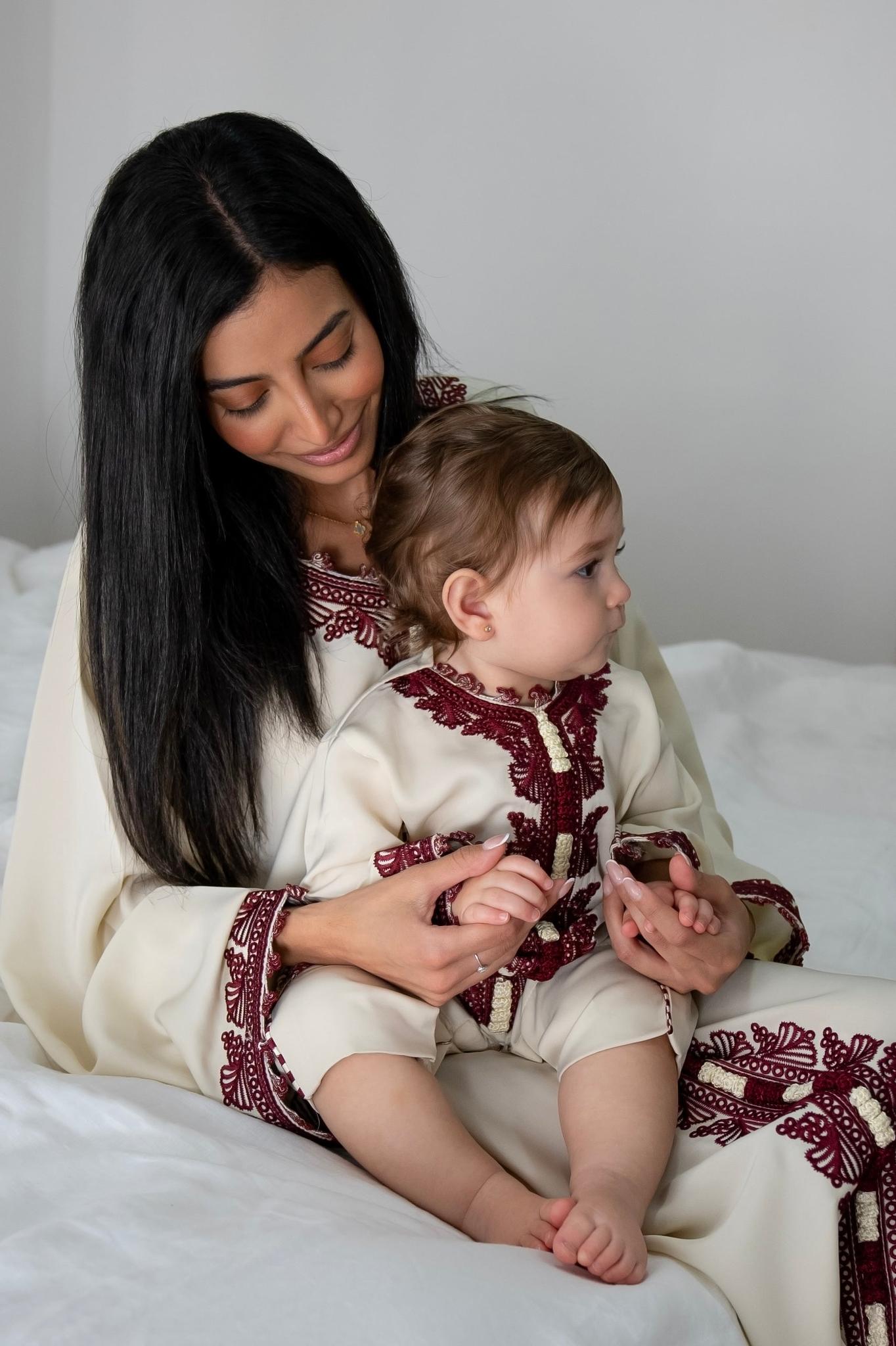 The North African inspired embroided Juwariya jalabeya is crafted with high quality materials, featuring intricate detailing, this jalabeya is sure to be a standout. Every detail of the rich maroon embroidery is designed to standout.
