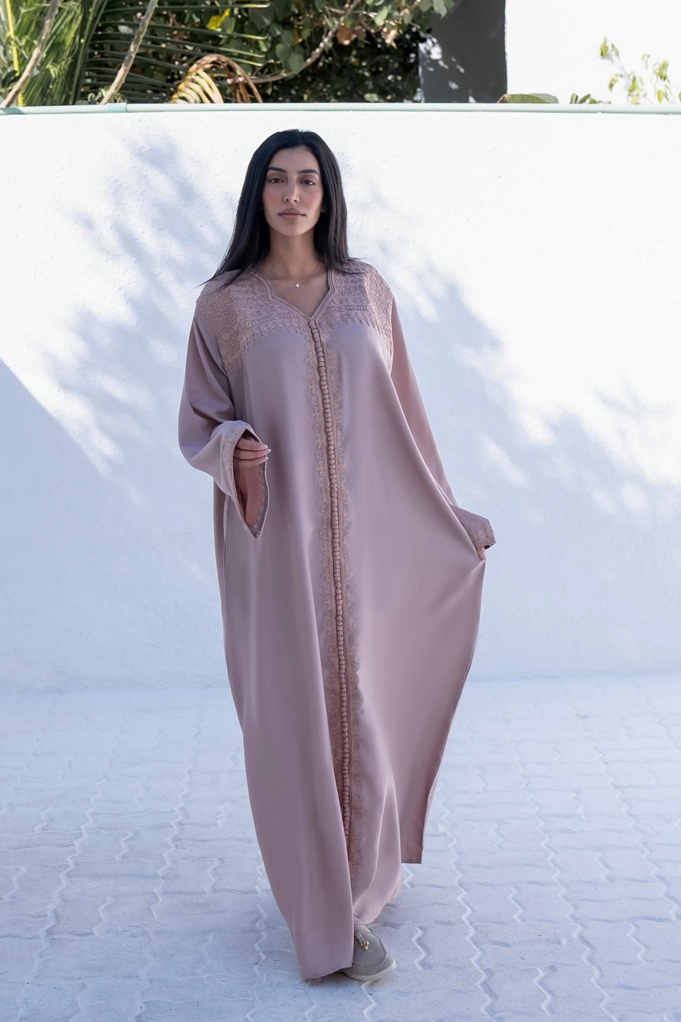 The North African inspired embroided Khawla jalabeya is crafted with high quality materials, featuring intricate detailing, this jalabeya is sure to be a standout. Every detail of the rich embroidery is designed to standout.