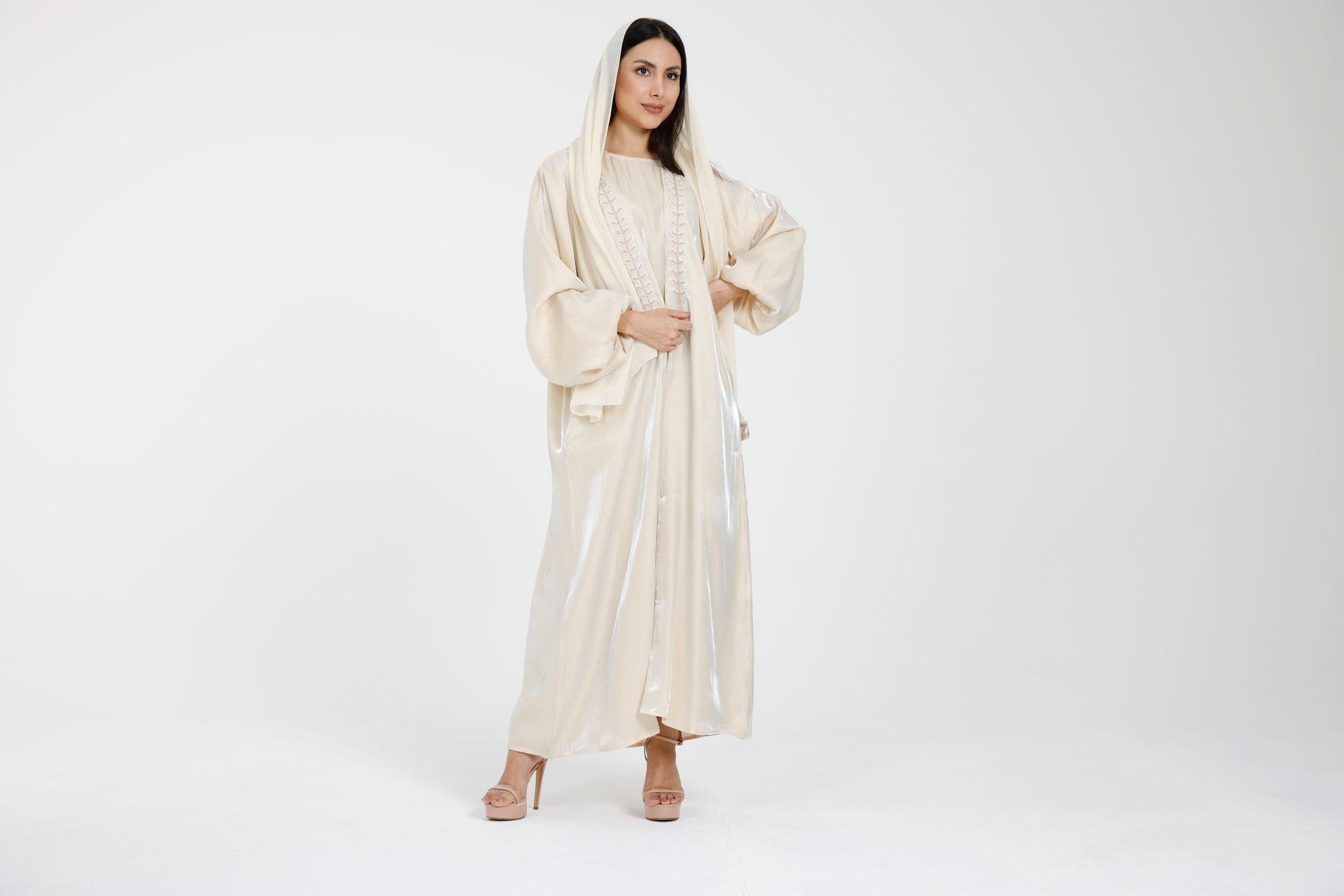 • Four piece cream abaya (Abaya, Slip dress, Hijab, Belt)