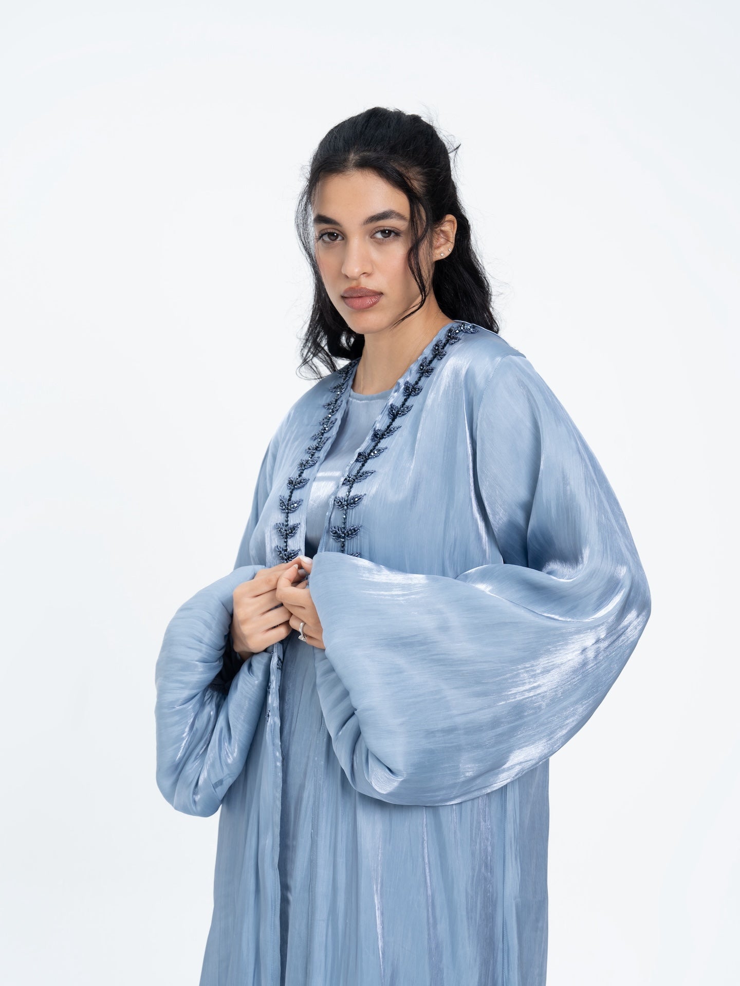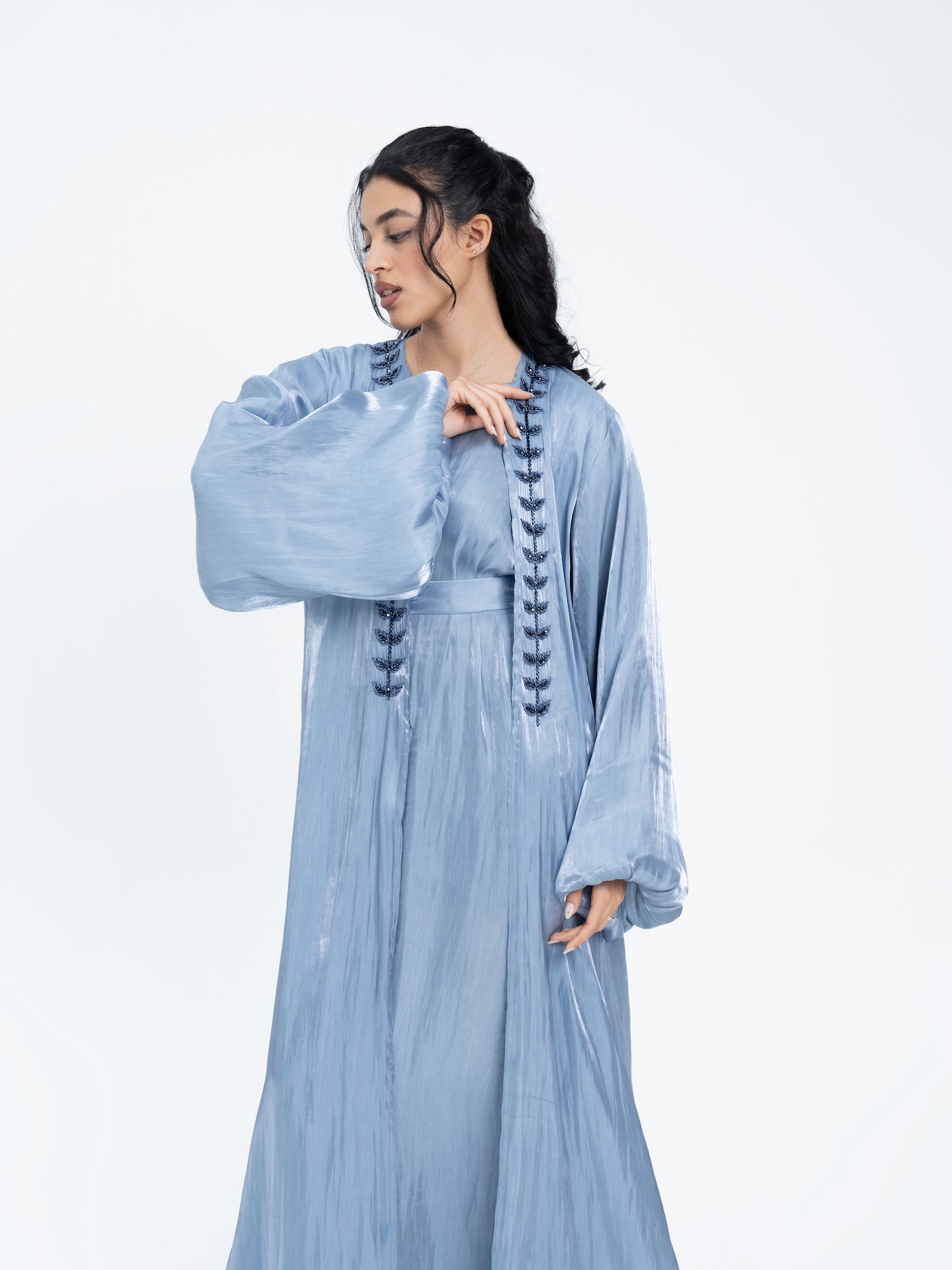 Be the definition of luxury in our four piece double hand embellished organza saphire abaya. The perfect addition to your wardrobe for those special occasions. Make an unforgettable statement of elegance and sophistication.