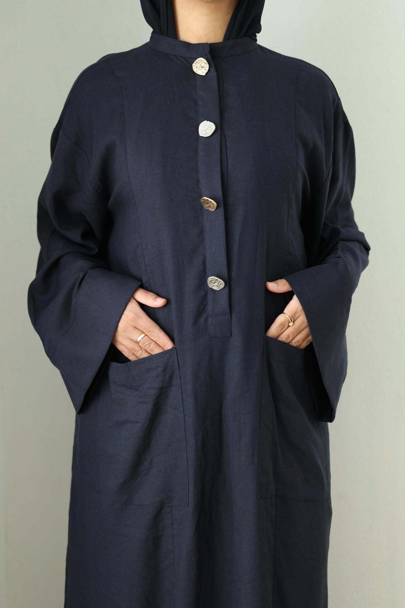 Crafted from 100% breathable linen, the Linen Kaftan Tunic Dress combines everyday comfort with effortless sophistication. Statement buttons—a striking mix of gold and silver tone charms and bold geometric accents—add a modern, elevated touch, while an adjustable buttoned side slit offers graceful movement without compromising modesty.