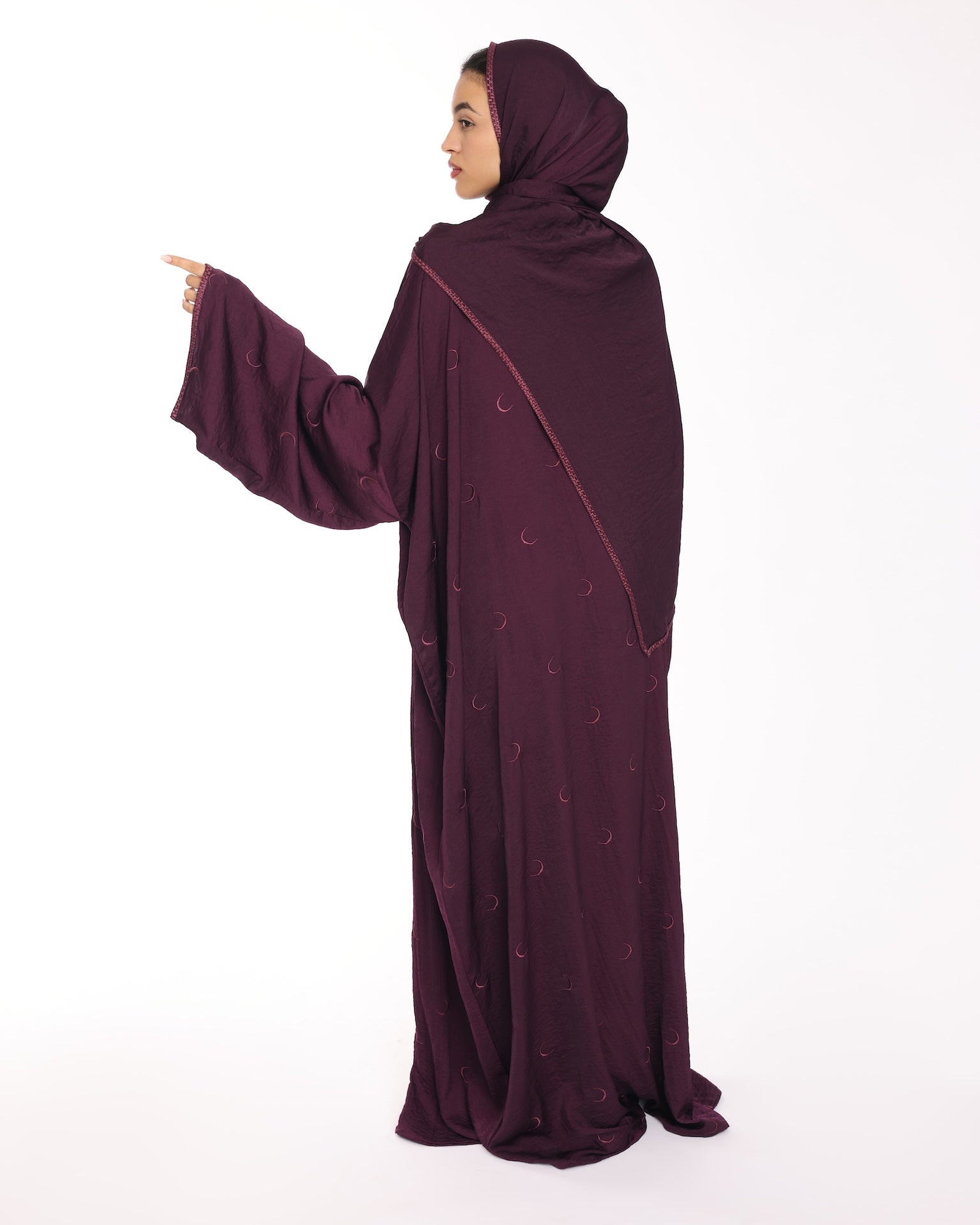 Luxurious Hareer prayer abaya with attached hijab. Designed with an attached hijab, this prayer abaya allows ease and elegance with every Salah. Getting you ready for Ramadan, its unique design is an essential for your nights of duas