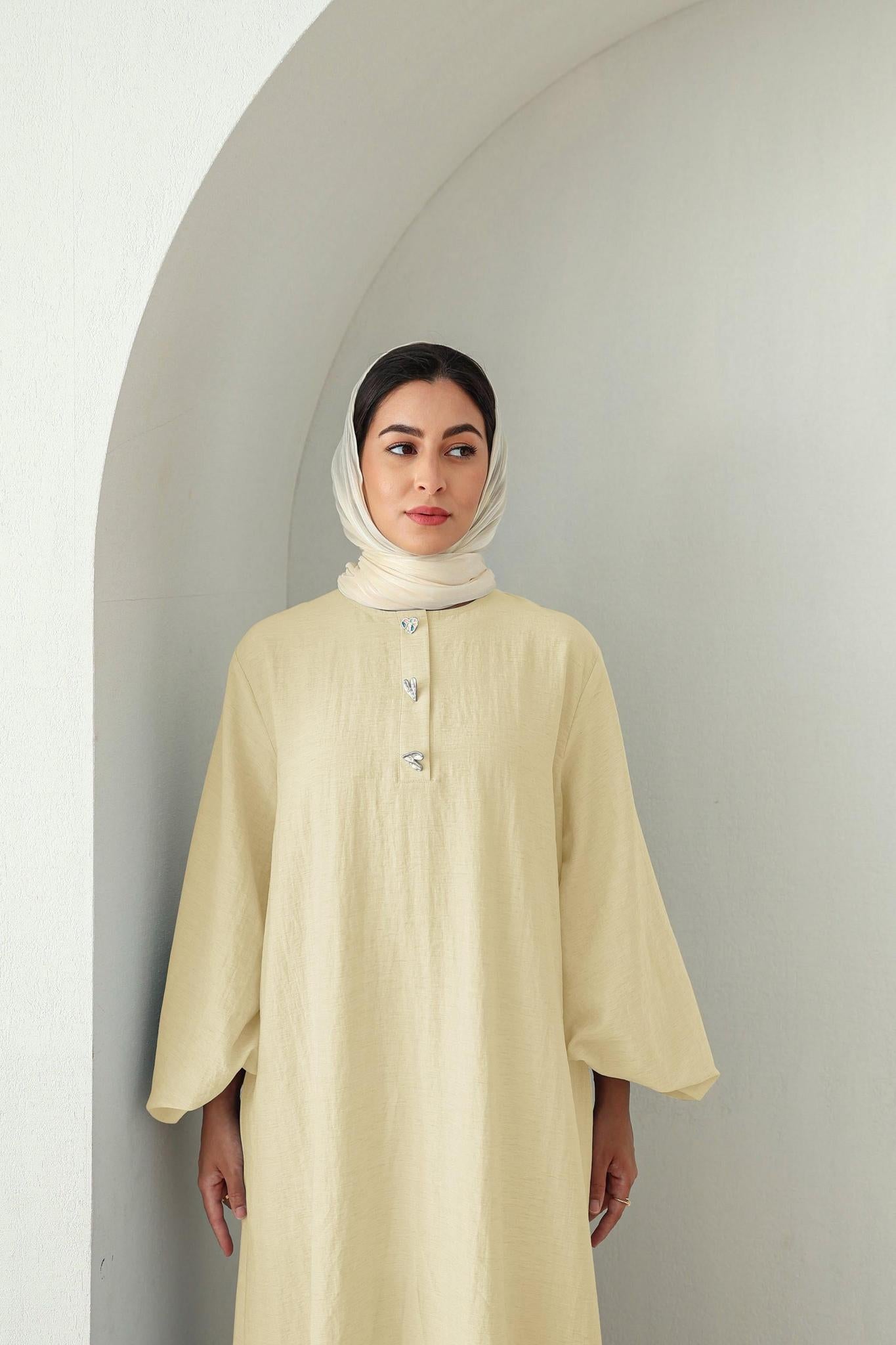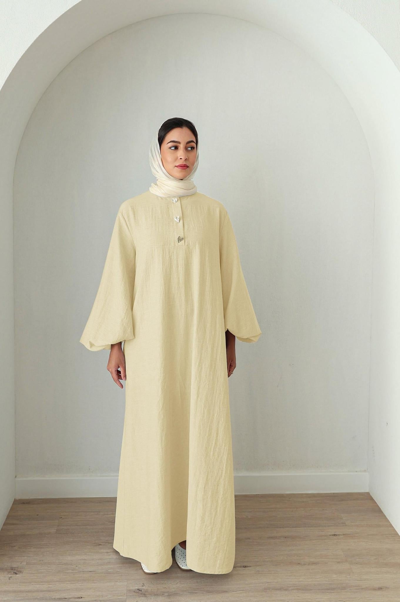 Breezy, modest, and effortlessly charming—this butter yellow dress is crafted from a cooling cotton-linen blend that’s perfect for warm, sunny days. The fabric is naturally breathable and lightweight, offering all-day comfort with an elegant drape.