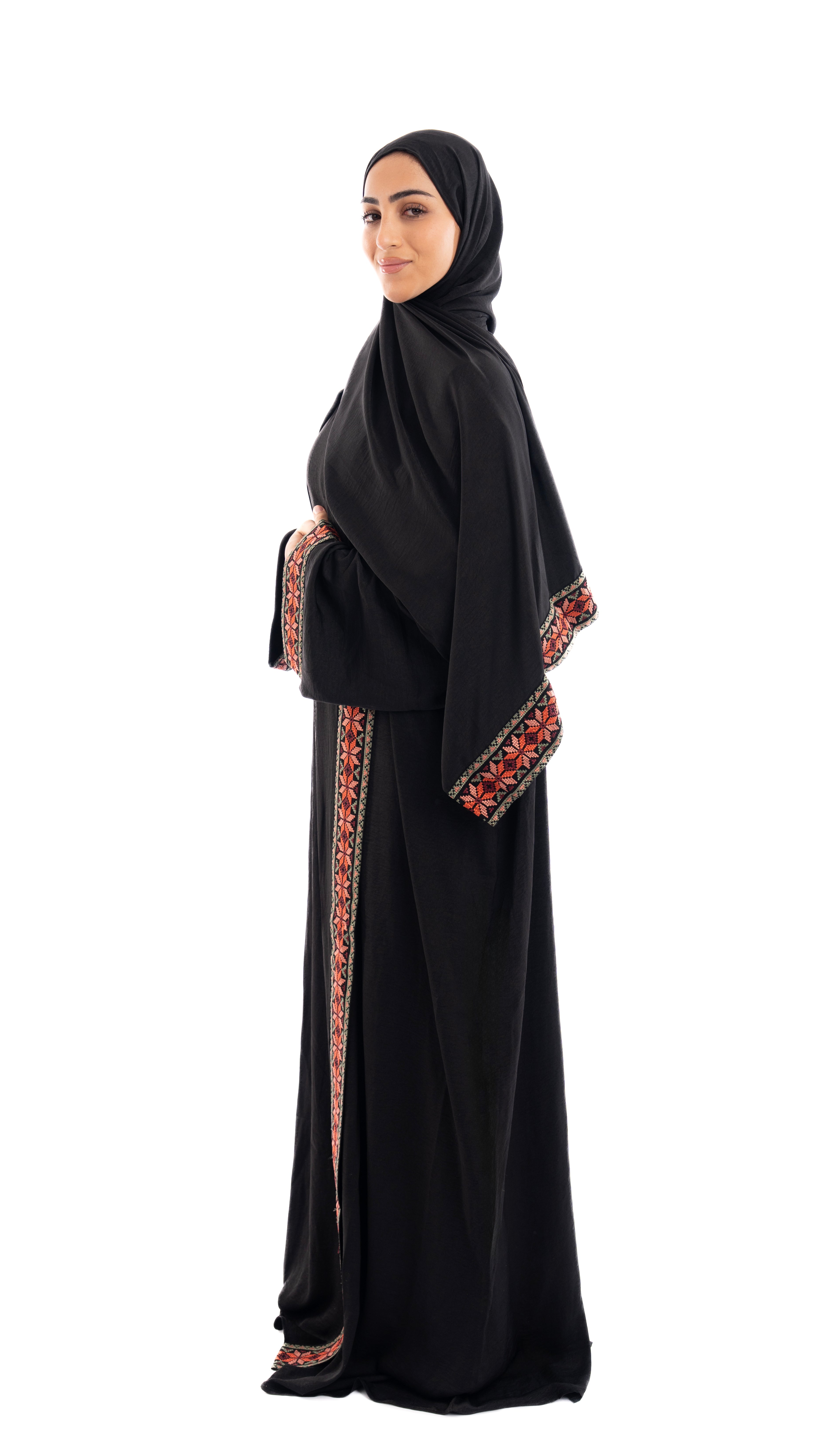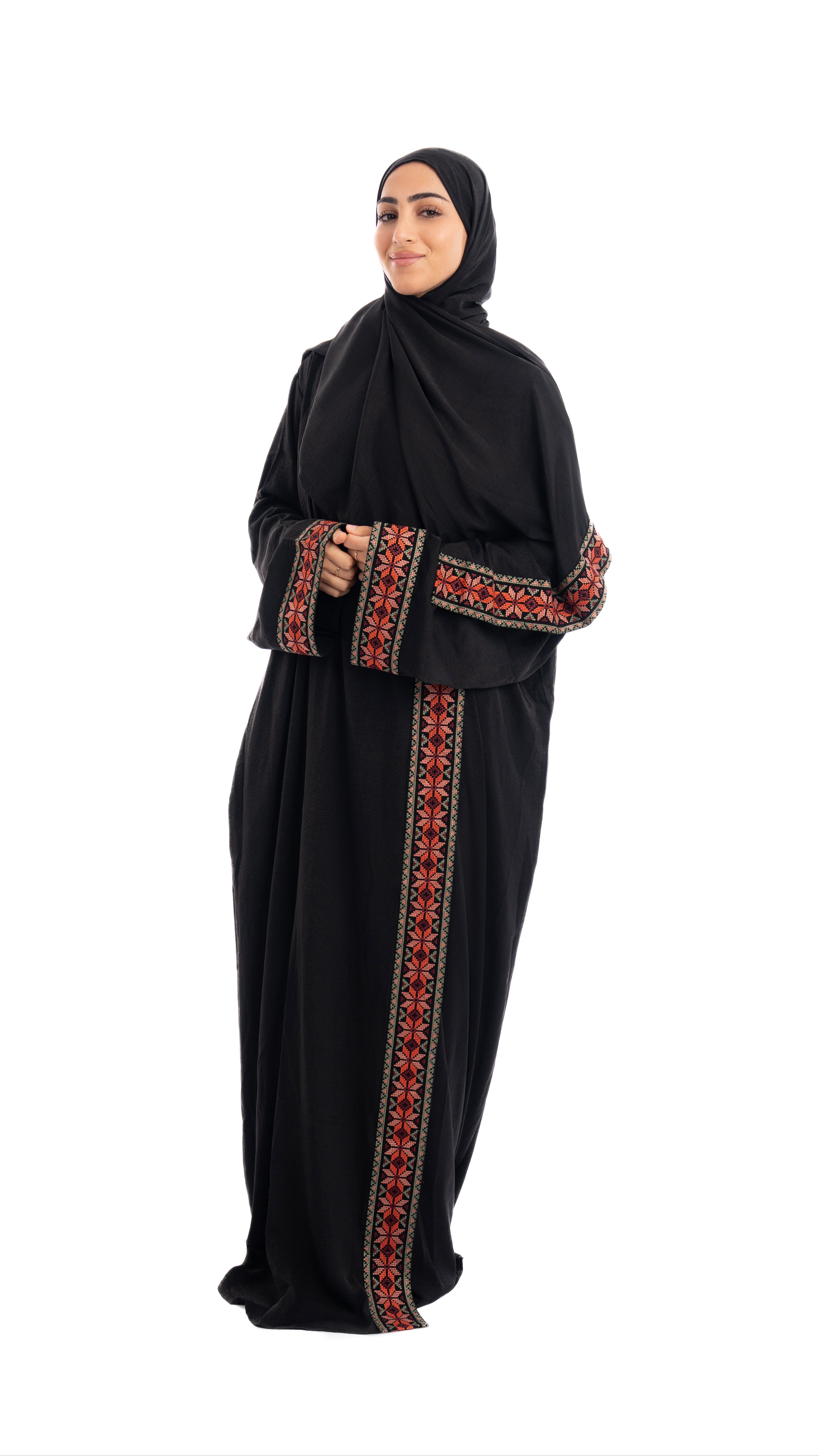 Luxurious Hareer wrap prayer abaya with attached hijab. Designed with an attached hijab, this prayer abaya allows ease and elegance with every Salah. A unique design that celebrates the tatreez embroidery. Getting you ready for Ramadan, its unique design is an essential for your nights of duas
